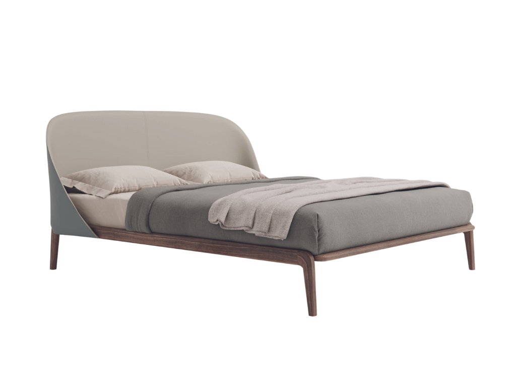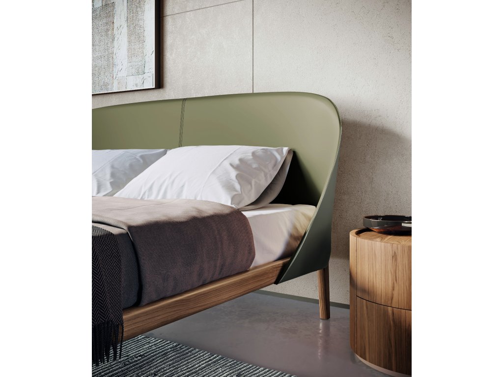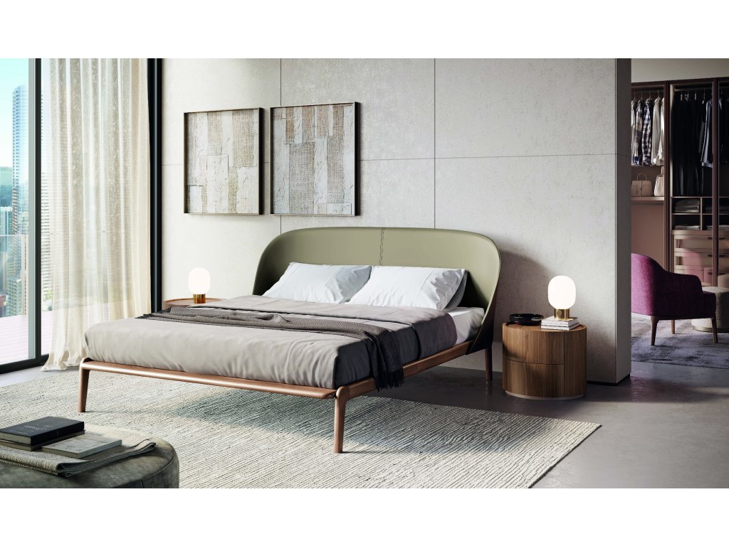 Dřevěný rám manželské postele Tamago v kombinaci s obepínajícím objetím čela ve tvaru mušle zve k přitulení.