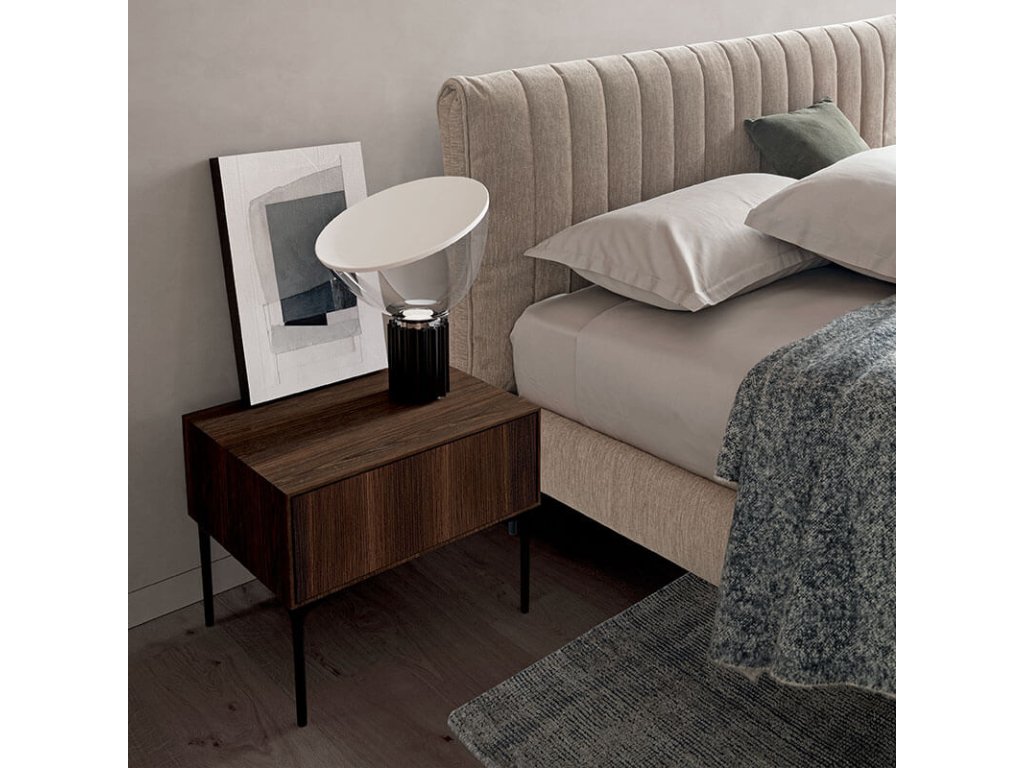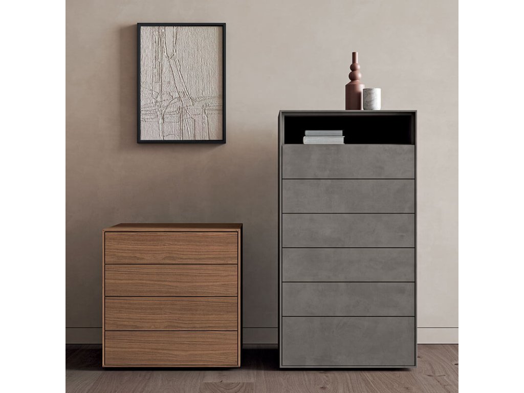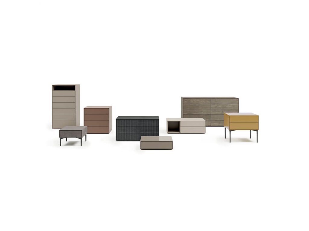 Modulární noční úložné jednotky pro závěsné použití nebo s kovovými nohami dvou výšek nebo skryté v základně a zásuvkami, košíky nebo otevřenými jednotkami různých velikostí. Vyznačují se čistotou, jednoduchostí a nádechem dynamiky díky 45° spojováním panelů.