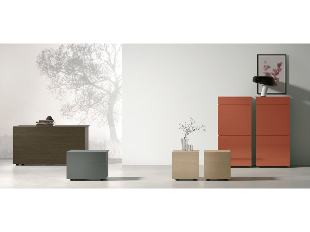 Komoda, noční stolky a jejich konstrukce je na výběr z široké škály barevných laků matném provedení, či z dubového dřeva odstín dub moka nebo dub pískový (pro konkrétní barvu kontaktuje obchodníka).