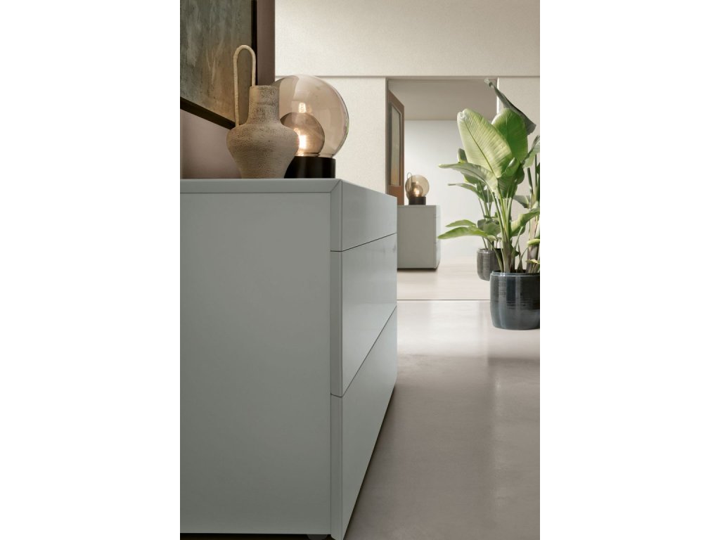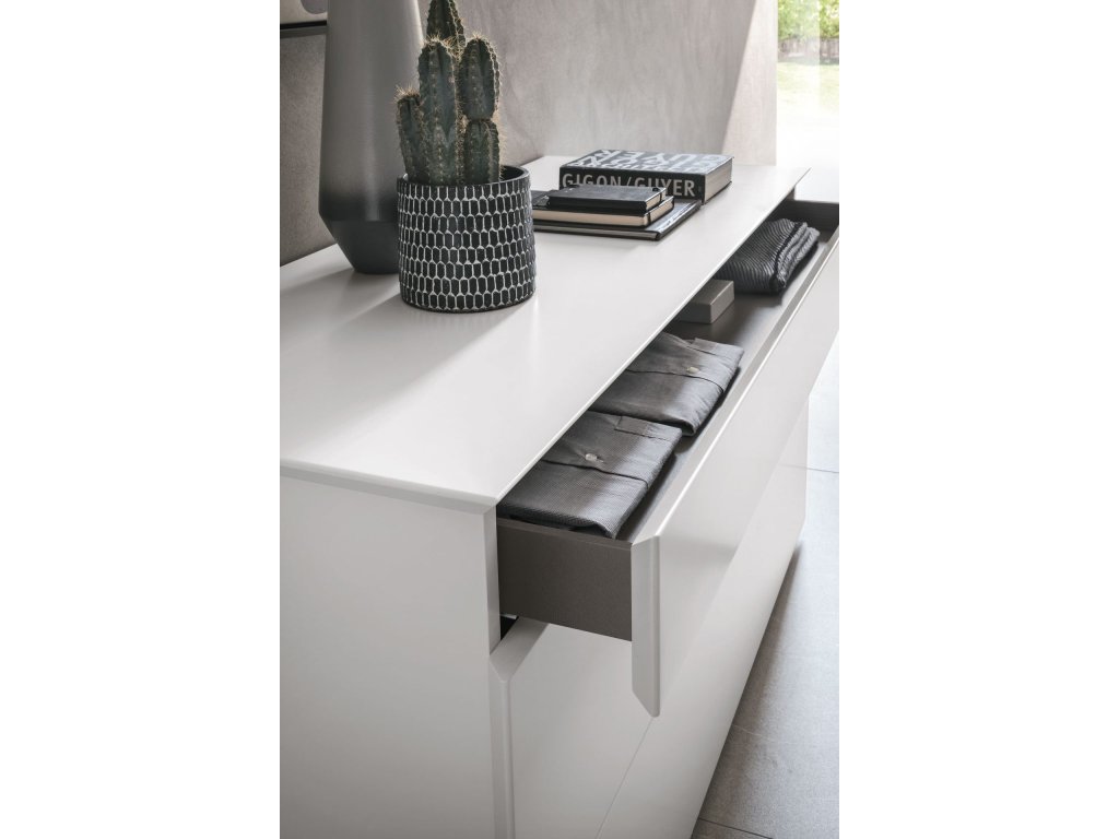 Skupina se na první pohled prezentuje zřejmou lineárností, ve skutečnosti však její charakter podtrhuje šikmý řez tloušťky zásuvek i desky. Vybavení pasparty pro všechny typy.
