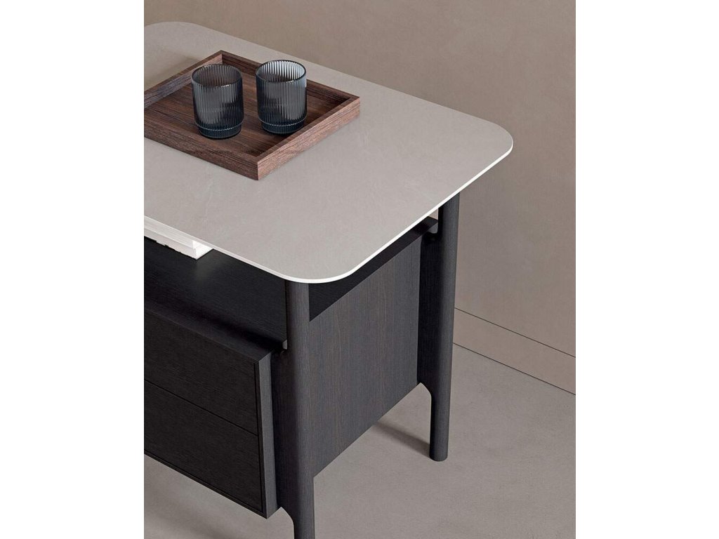 Lineární úložné prvky spočívají na měkce tvarovaném masivním rámu z jasanového dřeva v různých dřevěných dýhách, který dodává rázu a lehkosti dřevěným, kameninovým nebo skleněným deskám a integruje zásuvky. Kromě nohou jsou k dispozici další dřevěné kusy v řadě dřevěných dýh a laků.