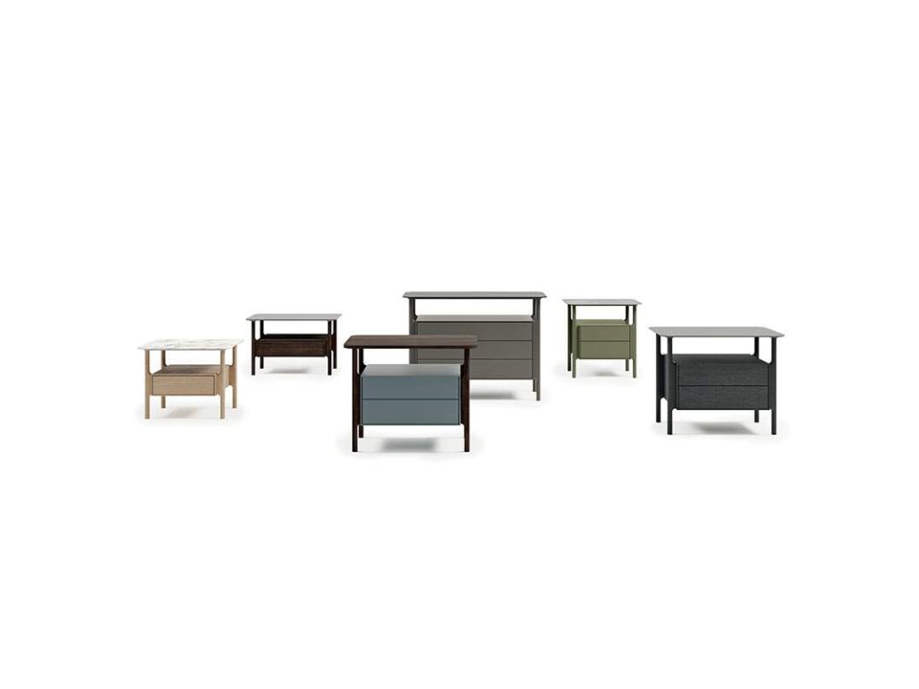 Křížení linií, materiálů a barev pro noční stolky Tepu, vysoké jednotky a vysoké jednotky. Mají design, který je lehký a zároveň bohatý; volí desky ze dřeva, kameniny nebo průhledného skla a jako podklad, který je podepírá, opět dřevo.